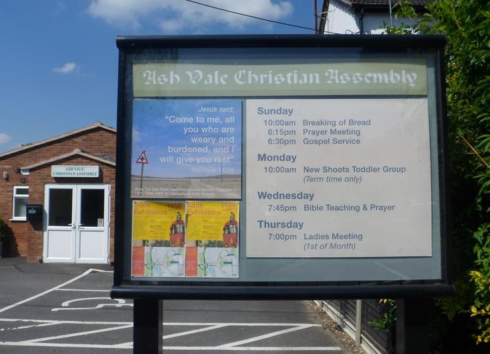 | Keywords: Ash Vale Christian Assembly, Frimley Road, Ash Vale (May 2014) (Noticeboard).JPG Church information board outside the Ash Vale Christian Assembly Frimley Road Ash Vale Borough of Guildford Surrey England own 2014-05-16 Hassocks5489 Ash Vale Christian Assembly May 2014 in Surrey Information boards in England Cc-zero |