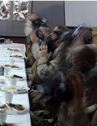Keywords: ASP Marines Raise Morale With Mess Night DVIDS26098.jpg en The Marines at the head table of the field mess night at Al Asad Iraq July 1 struggle furiously to get their gas masks on when a pungent smell hit their nostrils and Gas Gas Gas was called out at the banquet Being a tradition that has lived since the days of King Arthur and the Knights of the Round Table mess night is a banquet laced with ceremony and laughs for Marines to honor and recognize the Marines who came before them as well as to build onto their own camaraderie 2006-07-03 Cpl James Hoke https //www dvidshub net/image/26098 26098 2006-07-18 08 40 AL ASAD IQ PD-USGov Gas masks Images from DoD uploaded by Fæ |