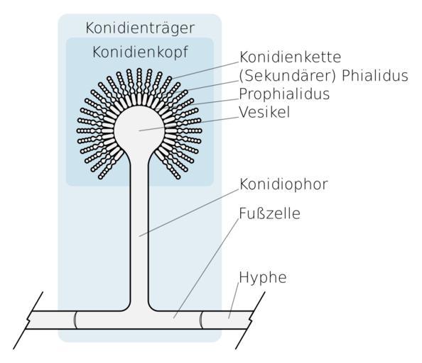 Keywords: Aspergillus-de.svg de Aspergillus-Sporenträger Aspergillus spore carrier own Benedikt Seidl 2010-03-30 Translation possible Aspergillus Fungus diagrams