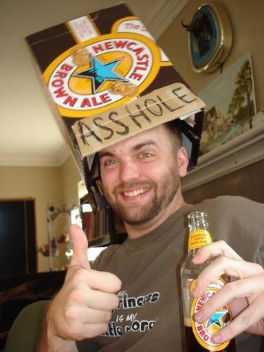 Keywords: Asshole hat.jpg 2007-02-01 own assumed ENDelt260~commonswiki Paper hats Men with beards Beards in the 21st century Thumbs up Men looking at viewer People with beer bottles Newcastle Brown Ale