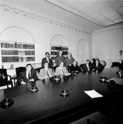 | Keywords: u.s. national archives usnationalarchives jfk presidential library jfkpresidentiallibrary blackandwhite monochrome indoor black and white Original Caption:  Assistant Press Secretary, Jay W. Gildner, with Visitors in Cabinet Room  We are looking for your help in identifying unknown people in our White House Photographs collection. If you have any information about this photograph, please post a comment, including any relevant sources, for the catalogers at the John F. Kennedy Presidential Library. Thank you!  Local Identifier: JFKWHP-ST-224-1-61  Created By: President (1961-1963 : Kennedy). Office of the Naval Aide to the President. (1961 - 1963)   From: President (1963-1969 : Johnson). White House Photograph Office. (1963 - 1969)  Contact:  John F. Kennedy Library (LP-JFK), Columbia Point  Boston, MA 02125-3398  Phone: 617-514-1600  Fax: 617-514-1652  Email: kennedy.library@nara.gov  Production Dates: 10/11/1961  Scope and Content Note: In this photograph Assistant Press Secretary, Jay W. Gildner (center), stands with eight unidentified visitors in the Cabinet Room of the White House, Washington, D.C.  Persistent URL:   JFK Library URL:  www.jfklibrary.org/Asset-Viewer/Archives/JFKWHP-ST-224-1-61.aspx  Access Restrictions: Unrestricted  Use Restrictions: Unrestricted Original Caption:  Assistant Press Secretary, Jay W. Gildner, with Visitors in Cabinet Room  We are looking for your help in identifying unknown people in our White House Photographs collection. If you have any information about this photograph, please post a comment, including any relevant sources, for the catalogers at the John F. Kennedy Presidential Library. Thank you!  Local Identifier: JFKWHP-ST-224-1-61  Created By: President (1961-1963 : Kennedy). Office of the Naval Aide to the President. (1961 - 1963)   From: President (1963-1969 : Johnson). White House Photograph Office. (1963 - 1969)  Contact:  John F. Kennedy Library (LP-JFK), Columbia Point  Boston, MA 02125-3398  Phone: 617-514-1600  Fax: 617-514-1652  Email: kennedy.library@nara.gov  Production Dates: 10/11/1961  Scope and Content Note: In this photograph Assistant Press Secretary, Jay W. Gildner (center), stands with eight unidentified visitors in the Cabinet Room of the White House, Washington, D.C.  Persistent URL:   JFK Library URL:  www.jfklibrary.org/Asset-Viewer/Archives/JFKWHP-ST-224-1-61.aspx  Access Restrictions: Unrestricted  Use Restrictions: Unrestricted  |