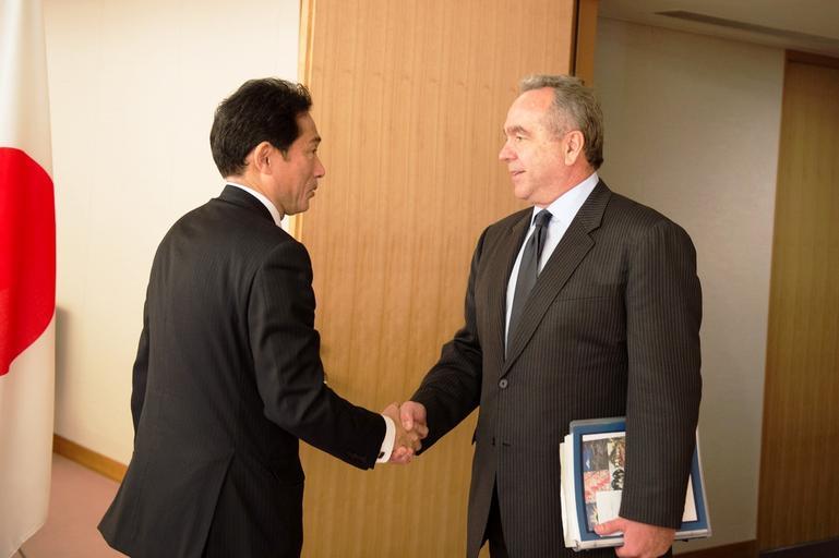 Keywords: Assistant Secretary Campbell Is Greeted By Japanese Foreign Minister Kishida.jpg en Assistant Secretary of State for East Asian and Pacific Affairs Kurt M Campbell is greeted by Japanese Foreign Minister Fumio Kishida before their meeting at the Ministry of Foreign Affairs in Tokyo Japan January 17 2013 State Department photo by William Ng/ Public Domain 2013-02-04 18 52 39 http //www flickr com/photos/statephotos/8390479474/sizes/o/in/photostream/ U S Department of State U S Department of State http //flickr com/photos/9364837 N06/8390479474 2013-02-04 13 50 12 United States Government Work PD-USGov Kurt M Campbell Fumio Kishida in 2013 Uploaded with UploadWizard |