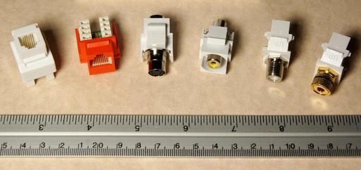 Keywords: Assortment of keystone modules.jpg en An assortment of keystone modules electrical connectors with different jacks Own Dmeranda 2009-05-21 Keystone modules Modular connectors BNC connectors RCA connectors F connectors Banana plugs Images with rulers to indicate scale |