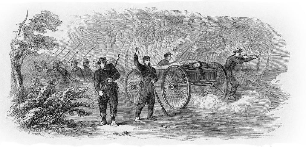 | Keywords: blackandwhite monochrome black and white The Duryea Zouaves Carrying off the Body of Lieu. Greble from the Field of Battle, Amidst the Fire of the Secession Forces, at Great Bethel. - Sketched by Our Special Artist (Published in Frank Leslie's Illustrated Newspaper, June 29, 1861.) The Battle of Big Bethel was one of the earliest land battles of the American Civil War. It took place on the Virginia Peninsula, near Newport News, on June 10, 1861. The Virginia State government had refused President Abraham Lincoln’s appeal for troops to put down the rebellion of the southern states, and its decision to secede from the Union was ratified by popular vote on May 23, 1861. Confederate Colonel (later Major General) John B. Magruder was sent down the peninsula to deter any advance on the state capital Richmond by Union troops based at the well-defended post of Fort Monroe. This garrison was commanded by Major General Benjamin Butler, a former Massachusetts lawyer and politician, who established a new camp at nearby Hampton and another at Newport News. Magruder had also established two camps, within range of the Union lines, at Big Bethel and Little Bethel, as a lure to draw his opponent into a premature action. Butler took the bait, when he and an aide, Major Theodore Winthrop, devised a plan for a dawn attack on June 10, 1861, after a night march to drive the Confederates back from their bases. Butler chose not to lead the force in person, for which he was later criticized. The plan proved too complex for his poorly-trained subordinates to carry out, especially at night, and his staff had also omitted to communicate the passwords. They were trying to advance without knowledge of the layout or strength of the Confederate positions, when a friendly fire incident gave away their own. The commander in the field, Massachusetts militia general Ebenezer Peirce, received the most criticism for the failed operation. The Union forces suffered 76 casualties, with 18 killed, including Major Winthrop and Lieutenant John T. Greble, the first regular army officer killed in the war. The Confederates suffered only 8 casualties, with 1 killed. Although Magruder subsequently withdrew to Yorktown and his defensive line along the Warwick River, he had won a propaganda victory and local Union forces attempted no further significant advance until the Peninsula Campaign of 1862. While small in comparison to many later battles, Big Bethel attracted considerable press coverage and exaggerated importance because of the newness of the war and the general feeling the war would be short. The engagement was also known as the Battle of Bethel Church or Great Bethel. Read more at en.wikipedia.org/wiki/Battle_of_Big_Bethel The Duryea Zouaves Carrying off the Body of Lieu. Greble from the Field of Battle, Amidst the Fire of the Secession Forces, at Great Bethel. - Sketched by Our Special Artist (Published in Frank Leslie's Illustrated Newspaper, June 29, 1861.) The Battle of Big Bethel was one of the earliest land battles of the American Civil War. It took place on the Virginia Peninsula, near Newport News, on June 10, 1861. The Virginia State government had refused President Abraham Lincoln’s appeal for troops to put down the rebellion of the southern states, and its decision to secede from the Union was ratified by popular vote on May 23, 1861. Confederate Colonel (later Major General) John B. Magruder was sent down the peninsula to deter any advance on the state capital Richmond by Union troops based at the well-defended post of Fort Monroe. This garrison was commanded by Major General Benjamin Butler, a former Massachusetts lawyer and politician, who established a new camp at nearby Hampton and another at Newport News. Magruder had also established two camps, within range of the Union lines, at Big Bethel and Little Bethel, as a lure to draw his opponent into a premature action. Butler took the bait, when he and an aide, Major Theodore Winthrop, devised a plan for a dawn attack on June 10, 1861, after a night march to drive the Confederates back from their bases. Butler chose not to lead the force in person, for which he was later criticized. The plan proved too complex for his poorly-trained subordinates to carry out, especially at night, and his staff had also omitted to communicate the passwords. They were trying to advance without knowledge of the layout or strength of the Confederate positions, when a friendly fire incident gave away their own. The commander in the field, Massachusetts militia general Ebenezer Peirce, received the most criticism for the failed operation. The Union forces suffered 76 casualties, with 18 killed, including Major Winthrop and Lieutenant John T. Greble, the first regular army officer killed in the war. The Confederates suffered only 8 casualties, with 1 killed. Although Magruder subsequently withdrew to Yorktown and his defensive line along the Warwick River, he had won a propaganda victory and local Union forces attempted no further significant advance until the Peninsula Campaign of 1862. While small in comparison to many later battles, Big Bethel attracted considerable press coverage and exaggerated importance because of the newness of the war and the general feeling the war would be short. The engagement was also known as the Battle of Bethel Church or Great Bethel. Read more at en.wikipedia.org/wiki/Battle_of_Big_Bethel |