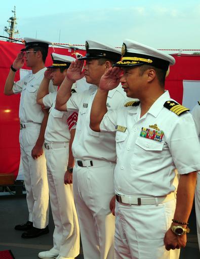 | Keywords: Atago (DDG-177), officers.jpg 米第3艦隊司令官R・W・ハント海軍中将に敬礼する あたご 3代目艦長・大野敏弘1等海佐(手前)<ref>See the http //www webcitation org/62ZmIm1P6 official site of Escort Flotilla 3 JMSDF </ref>と乗組員たち 珠湾にて JS Atago DDG 177 for a Rim of the Pacific RIMPAC 2010 reception ---- <small> reflist </small> 2010-06-02 <div style font-size 92 >rotated and cropped from</div>File US Navy 100628-N-3570S-022 Vice Adm Richard W Hunt is greeted as he arrives aboard the Japan Maritime Self-Defense Force guided-missile destroyer JS Atago DDG 177 jpg U S Navy photo by Mass Communication Specialist 2nd Class Jeremy M Starr PD-USGov-Military-Navy 110px JS Atago DDG-177 Naval officers of the JMSDF Uniforms of the JMSDF RIMPAC 2010 Salutes Richard W Hunt |
