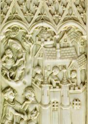 Keywords: Atelier of the Boxes - Writing Tablet and Lid - Walters 71283 - View A Detail A.jpg During the Middle Ages paper and parchment were expensive and many people took advantage of less permanent forms of written communication One side of an ivory tablet was coated with wax; then a message was incised in the wax with a stylus which looks like a large pin and protected by an ivory lid The little box would be sent to the recipient who smoothed the wax and responded The sliding cover depicts three ladies in the town looking over its walls at two embracing couples seen to the left The bottom of the box shows the same town at greater distance a tent with two more lovers a hawking expedition and a hermit reading outside his rustic cell Several writing boxes are known from the same otherwise unidentified workshop between 1340 1360 Medieval ivory H 3 11/16 x W 2 1/8 x D of tablet and lid together 7/16 in 9 3 x 5 4 x 1 1 cm accession number 71 283 9704 Sale Cologne December 14 1893 no 92 Marcus Antocolsky Paris date and mode of acquisition unknown Marcus Antocolsky Sale Hotel Drouot Paris June 10 1901 no 73 George Robinson Harding London date and mode of acquisition unknown Henry Walters Baltimore June 15 1901 by purchase Walters Art Museum Henry Walters Acquired by Henry Walters 1901 The International Style The Arts in Europe Around 1400 The Walters Art Gallery Baltimore 1962 Images of Love and Death in Late Medieval and Renaissance Art The University of Michigan Museum of Art Ann Arbor 1975-1976 The Medieval Garden Spencer Museum of Art Lawrence; Dumbarton Oaks Washington 1983 Images in Ivory Precious Objects of the Gothic Age The Detroit Institute of Arts Detroit; The Walters Art Gallery Baltimore 1997 place of origin north France Walters Art Museum license Medieval ivory in the Walters Art Museum Atelier of the Boxes Media contributed by the Walters Art Museum needs category review |