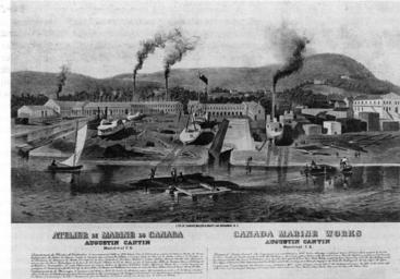 | Keywords: Atelier de Marine du Canada - Augustin Cantin - Montreal Canada-Est.jpg fr Atelier de Marine du Canada Augustin Cantin Montréal Canada-Est<br> « Augustin Cantin 1809-1893 constructeur de navires né à Cap-Santé Il apprit à Québec le métier de charpentier de navires puis il vint s ™Ã©tablir à Montréal où il fonda en 1841 un premier chantier de construction de bateaux à l ™angle des rues Prince et de la Commune Pendant les travaux d ™Ã©largissement des écluses Saint-Gabriel du canal Lachine entre 1843-1848 il aménage un nouveau chantier entre les rues Canning et Atwater ce qui lui assura l ™aisance et la notoriété Un de ses fils continua l ™Å“uvre de son père sous le nom de Canada Dry Dock Co puis de Canada Marine Works » “ http //www shpsc org/rues_et_parcs html shpsc org http //bv cdeacf ca/bvdoc php no 2005_04_0512 col EA format htm ver old bv cdeacf ca 1857 http //www shpsc org/rues_parcs/augustin-cantin-ateliers jpg shpsc org Lith of Sarony Major Knapp 440 Broadway N Y other versions PD-old-70-1923 Lachine Canal Montreal in the 1850s |
