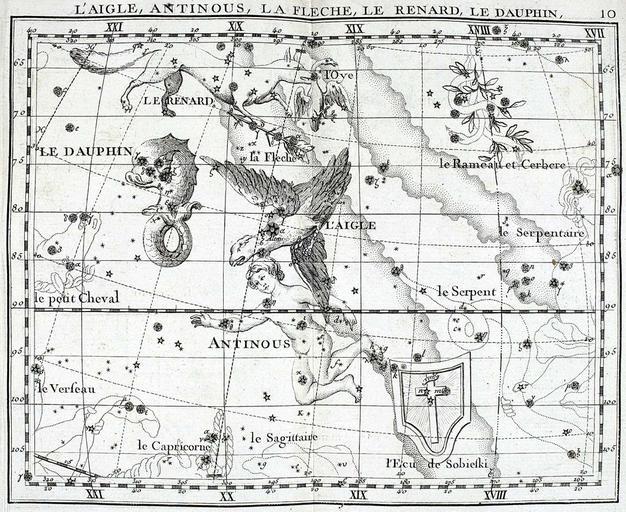 | Keywords: Atlas Coelestis-10.jpg Atlas Coelestis http //www lindahall org/services/digital/ebooks/flamsteed1776/index shtml 1776 John Flamsteed PD-old-100 Atlas coelestis by John Flamsteed Aquila constellation Antinous constellation Sagitta Vulpecula Delphinus constellation Scutum |