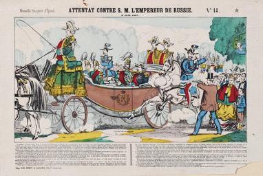 | Keywords: ATTENTAT CONTRE S.M. L'EMPEREUR DE RUSSIE (1867-05-25). Nouvelle Imaqerie d'Epinal 6 juin 1867 №14.jpg fr ATTENTAT CONTRE S M L'EMPEREUR DE RUSSIE 1867-05-25 Nouvelle Imaqerie d'Epinal 6 juin 1867 14 ru Покушение на Александ а II 25 мая 1867 года Лист 14 из газеты «d'Epinal» 6 июня 1867 года ате иал техника бумага литог афия аск аска аква елью Разме л 27 6 46 1см; и 19 2 36 0см см оме в Госкаталоге 4527494 оме по ГИК КП КП1051 Инвента ный номе Г1519 естонахождение Госуда ственное бюджетное уч еждение культу ы Све дловской области И битский госуда ственный музей изоб азительных искусств Описание в каталоге ногофигу ная композиция В цент е сп ава налево движется ко ичневая ка ета-коляска с вензелем и буквой «N» В ней сидят сп ава и слева по двое мужчин в военной фо ме в касках с плюмажем и лентами че ез плечо У одного из мужчин на голове т еуголка у д угого на лице усы и бакенба ды а облучке с зеленым ба хатом сидит куче с кнутом и поводьями в уках в зеленом камзоле Видна задняя часть зап яженных белых лошадей За ка етой двое солдат в одинаковой фо ме Слева от ка еты скачет всадник в синей фо ме вытянув левую уку в сто ону Рядом сп ава мужчина изоб аженный со спины ¾ влево кото ый стоит асставив ноги де жа уки пе ед г удью ст еляющий из пистолета по нап авлению ка еты Сп ава и в глубине в яд г уппы людей мужчины женщины дети военные ужчины машут цилинд ами ад изоб ажением г ави ованные надписи Nouvelle Imaqerie d`Epinal ATTENTAT CONTRE S M L`EMPEREUR DE RUSSIE 14 /6 juin 1867 Под изоб ажение текст на иност анном языке в два столбца слева в 15 ст ок сп ава 16 ст ок иже слева Imp Lith PINOT SAGAIRE Edit a`Epinal; сп ава IV 1867-06-06 http //госкаталог ф/portal/ /collections id 4477222 Покушение на усского импе ато а 6 июня 1867года Лист 14 из газеты «d`Epinal» d`Epinal other versions Custom license marker 2016 05 06 PD-old-100 Images d'Épinal Images uploaded by Alexander Krassotkin in 2016 Alexander II of Russia Antoni Berezowski |