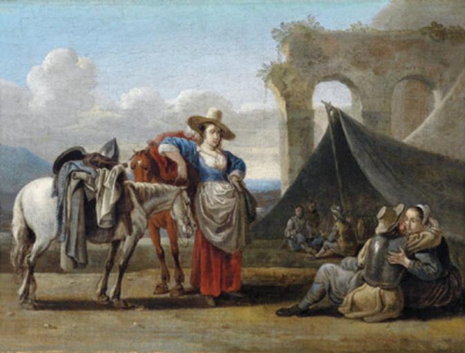 | Keywords: Attributed to Jan van den Hecke (I) 001.jpg  attributed to 1635-1684 Oil on canvas cm 26 8 36 7 unknown 56155 object history ProvenanceEvent 2000-05-09 anonymous sale Christie's Amsterdam 11 unknown ProvenanceEvent 2008-10-15 anonymous sale Dorotheum Vienna 398 unknown Jan van der Hecke I LangSwitch or of oder Johannes Lingelbach credit line accession number internet PD-old-100 Jan van den Hecke Attributed Aqueducts in Rome in art 17th-century paintings of soldiers Military people and civilians in art 17th-century oil on canvas paintings People and ruins in paintings People with tents 17th-century military life Paintings of couples in love Hugging in art Military tents in art Images from Dorotheum 17th-century paintings location missing Vivandière White horses in art |