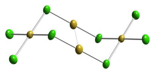 | Keywords: Au4Cl8-from-xtal-1982-CM-3D-ellipsoids.png Thermal ellipsoid diagram of the gold I III chloride molecule Au<sub>4</sub>Cl<sub>8</sub> as found in the crystal structure Colour code Gold Au golden -yellow Chlorine Cl green Crystal structure from http //dx doi org/10 1039/DT9820002257 J Chem Soc Dalton Trans 1982 2257-2260 Image generated in http //www crystalmaker com/ CrystalMaker 8 3 Own 2010-08-05 Ben Mills Benjah-bmm27 Images by Ben Mills Ball-and-stick models Crystal structures of gold I III chloride Thermal ellipsoids Crystal structures in space group number 2 |