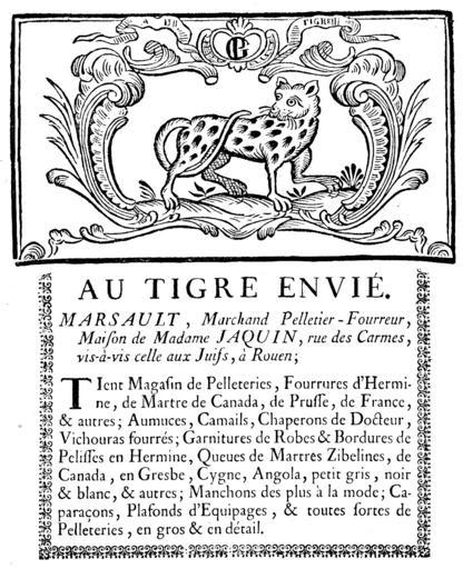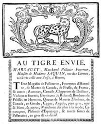| Keywords: Au Tigre Envié.jpg  Au Tigre Envié MARSAULT Marchand Pelletier - Fourreur Maison de Madame JAQUIN rue de Carmes vis-à-vis celle aux Juifs à Rouen; Tient Magasin de Pelleteries Fourrures d'Hermine de Martre de Canada de Prusse de France autres; Amuces Camails Chaperons de Docteur Vichouras fourrés; Garnitures de Robes Bordures de Pelisses en Hermine Queues de Martres Zibelines de Canada en Gresbe Cygne Angola petit gris noir blanc autres; Manchons des plus à la mode; Caparaçons Plafonds d'Equipages toutes fortes de Pelleteries en gros en détail F 6 - Collection Housard Une enseigne bien caractéristique de l'extrême fin du XVIII<sup>e</sup> siècle et qui précise bien l'activuté des fourreurs de 1790 à 1815 Biblioth du Museée des Arts et Traditions Populaires - Doc cummuniqué par Mlle Marie-Louise Sarrabezolles Jean-H Prat Fourrure et Pelletiers A travers les ages Édition du Tigre Paris ca 1952 Page 244 / Collection G C Franke book between 1790 1815 author PD-old Fourrure et Pelletiers A travers les ages 244 Furriers in Rouen Marsault Fur fashion in 1802 Coats of arms of furriers Fur advertising Marsault Rue des Carmes Rouen Musée des Arts et Traditions populaires |