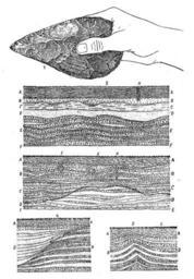| Keywords: Aubeville stone tool.jpg Слика 24  1 О уђе од к емена најста ијег к оја из места Абвила у Ф анцуској  асликано је како се у  уци д жало  2 Девет мета а дубок п осек у  ечноме наносу код Сент-Ашела у Ф анцуској A је ц вена песковита глина за цигле изнад које је танак слој живице B је глина са шљунком кога има на очито много на дну слоја C је слој глиновитог а D слој ошт ог песка са ситним  ечним и сувоземним шкољкама E је низ слојева к упног и ситног шљунка са пово кама песка F је пов шина к етацејскога те ена п еко кога су наслагани дилувијални слојеви H је  имски г об Палеолитски најста ији а тефакти леже помешани са костима изум лих сиса а у слојевима E а има их и у слојевима D и C  3 4 и 5 јесу 5-9 м дубоки п осеци у наносу код Шела  а њима се испод живице види слој атмосфе скога ц венога дилувијума А са ћошкастим шљунком У п воме п осеку сл 3 B C и D означују слојеве песка и шљунка која су у C окамењени а сад же о уђа п вога века E је те ција ни те ен на коме лежи дилувијум Сп ам F и H виде се п оди и го њих слојева у  овине доњих   а сл 4 познаје се како су п ви дилувијални слојеви B  азнети па се по њима наслагали млађи мустије ски слојеви D Код E је један е атичан камен   а сл 5 сп ам D се познаје да су  ечни дилувијални наноси наб ани п е него се наслагао атмосфе ски нанос A Project Rastko Kameno doba Paleolithic Acheulean |