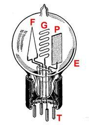 | Keywords: Audion vacuum tube construction.png Audion the first triode vacuum tube invented in 1906 by Lee De Forest Part of the tube base is shown removed to reveal the terminals The parts are F - Cathode consisting of a U-shaped platinum wire filament heated to incandescence by a current G - Grid consisting of a 25 mil nickel wire in a zigzag shape P - Plate anode electrode consisting of 9/16 in square of 5 mil sheet nickel E - Evacuated sealed glass envelope In later vacuum tubes this was evacuated to 10<sup>-9</sup> atmosphere In the Audion some gas was deliberately left in the tube T - Terminal pins plugged into a socket to connect the tube to the external circuit The filament in vacuum tubes eventually burned out so they had to be replaced periodically The spacing between the filament grid and plate in the drawing is exaggerated for clarity; in actual tubes the elements were only about 1 millimeter apart Alterations to image Removed existing labels and replaced them with red labels 1952 Retrieved 17 October 2013 from http //www tubebooks org/Books/intro_army_theory pdf Basic Theory and Application of Electron Tubes US Dept of the Army Technical Manual TM 11-662 February 1952 p 4 fig 4 on Pete Miller's http //www tubebooks org/index html tubebooks org website K E Thiebaud PD-USGov Uploaded with UploadWizard Audion Vacuum triodes |