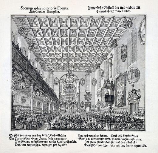 Keywords: Augsburg Ichnographicae Ev Kreuzkirche Innerliche Gestalt.jpg Innerliche Gestalt der neu-erbauten Evangelischen Creutz-Kirche aus J J Kraus Ichnographicae atque scenographicae delineationes templi Cruciani Evangelici Augustani Das ist Wahre und eigentliche Abbildung der alten Evangelischen Kirchen zum H Creutz in Augsburg wie auch der heutigen auf den alten Platz weit herrlicher und schöner neu-erbauten Evangelischen Kirchen Zum andernmahl aufgelegt und vermehret und von M S H mit wohlgefaßten Versen gezieret Anjezo aber auf ein neues mit viel Sinnbilder außgezieret worden durch Johann Ulrich Kraußen Augsburg 1703 http //zisska de/ Zisska Schauer 1703 author PD-old-100 Images from Zisska Schauer Evangelische Heilig-Kreuz-Kirche Augsburg History of Augsburg 1703 engravings Interiors of churches in art Church services Sermons in art |