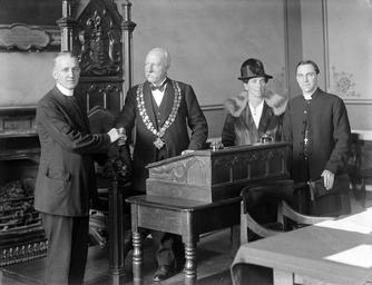 Keywords: lord mayor lordmayor e. walsh ewalsh fr. walsh frwalsh city hall cityhall priests chain of office chainofoffice ireland august 1928 1920s poole collection poolecollection glass negative glassnegative a.h. poole ahpoole arthur henri poole arthurhenripoole edward walsh edwardwalsh monday 20th twenties 20th century 20thcentury waterford national library of ireland nationallibraryofireland people groupshot blackandwhite monochrome black and white The Lord Mayor of Waterford, Edward Walsh offering a civic welcome to Fr. Walsh. We assume the woman in the photo is the Lord Mayor's wife. Hope that the two Walshes is not confusion on the part of the photographer, or in Poole Photographic records, so would welcome clarification if anyone can provide it. Also interested to know what Fr. Walsh had done to deserve a "civic welcome"? Date: Monday, 20 August 1928 NLI Ref.: P_WP_3548 The Lord Mayor of Waterford, Edward Walsh offering a civic welcome to Fr. Walsh. We assume the woman in the photo is the Lord Mayor's wife. Hope that the two Walshes is not confusion on the part of the photographer, or in Poole Photographic records, so would welcome clarification if anyone can provide it. Also interested to know what Fr. Walsh had done to deserve a "civic welcome"? Date: Monday, 20 August 1928 NLI Ref.: P_WP_3548 |