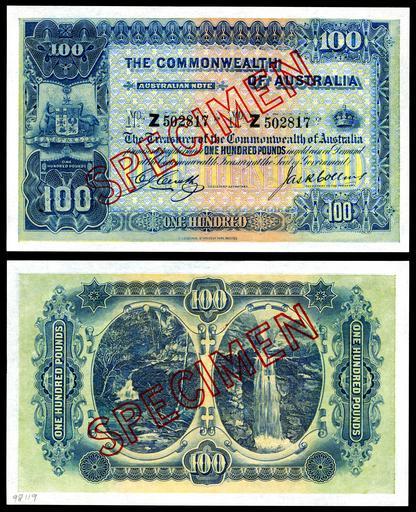 | Keywords: AUS-9c-Commonwealth of Australia-100 Pounds (1918).jpg Commonwealth of Australia one-hundred-pound specimen note 1918 1918 note 2015 image Image by Godot13 Thomas S Harrison Engraver Printer for the Commonwealth of Australia Institution Smithsonian National Museum of American History Use of this image should give credit to the National Numismatic Collection National Museum of American History other versions Assessments 1 Banknotes of the Australian pound “ Series of 1918 and 1923 “1925 PD-Australia-currency PD-1923 self cc-by-sa-4 0 Godot13 National Numismatic Collection <br>National Museum of American History 2013030510011547 2015 User Godot13 NNC Banknotes scanned by User Godot13 NNC Foreign Banknotes Banknotes of Australia Uploaded with UploadWizard Coats of arms of Australia on money Banknotes with a face value of 100 Featured Pictures English Wikipedia by User Godot13 NNC banknote Featured Pictures English Wikipedia |