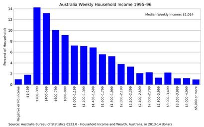 | Keywords: Australia household income 1996.svg en Weekly household income distribution of Australia in 1995-1996 Data from Australian Bureau of Statistics http //www abs gov au/AUSSTATS/abs nsf/DetailsPage/6523 02013-14 Household Income and Wealth 2016-06-17 own Delphi234 other versions cc-zero Income distribution in Australia |