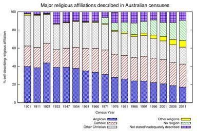 | Keywords: AustralianReligiousAffiliation 2.svg This is an attempt to replace the jpeg File AustralianReligiousAffiliationGraphWithoutTable jpg with a svg version Created by using gnuplot 4 4 patchlevel 0-rc1 it allowed me to modify font size of the key which the current stable release does not Script <pre> set terminal svg enhanced fname Helvetica fsize 10 size 600 500 set output AustralianReligiousAffiliation svg set style histogram rowstacked set boxwidth 7 absolute set style fill solid 1 0 border -1 set style data histograms set yrange 0 100 set ylabel self-describing religious affiliation set xlabel Census Year set key outside bottom right horizontal font Helvetica 8 set title Major religious affiliations described in Australian censuses font Helvetica 14 plot 'australia data-2' \ using 2 t Anglican fs pattern 2 lc rgb blue \ using 3 t Catholic fs pattern 5 lc rgb red \ using 4 t Other Christian fs pattern 1 lc rgb gray \ using 6 t Other religions fs solid lc rgb yellow \ using 7 t No religion fs pattern 4 lc rgb green \ using 8 xtic 1 t Not stated/inadequately described fs pattern 3 lc rgb purple </pre> Data was from own Erp talk created this work entirely by myself 1 2010-02-14 ; 2012 06 22 last version Erp talk / Erp wikipedia en 150px 150px Erp Original upload log en wikipedia AustralianReligiousAffiliation svg wikitable - 2012-06-22 03 46 600×400× 39166 bytes Erp <nowiki>Added the data for 2011 made slightly wider to fit</nowiki> - 2010-02-16 06 13 500×400× 37340 bytes Erp <nowiki>vertical size decreased</nowiki> - 2010-02-16 06 07 500×450× 37372 bytes Erp <nowiki>changed size slightly</nowiki> - 2010-02-15 17 57 600×500× 37450 bytes Erp <nowiki>resized in output of gnuplot</nowiki> - 2010-02-15 08 20 900×600× 78865 bytes Erp <nowiki>change to pattern and helvetic font</nowiki> - 2010-02-14 16 26 900×600× 61997 bytes Erp <nowiki>font size modification</nowiki> - 2010-02-14 15 53 900×600× 62069 bytes Erp <nowiki>modifying fonts</nowiki> - 2010-02-14 15 36 900×600× 61439 bytes Erp <nowiki> created from data provided by Yearbook Australia 2008 I ~~~ created this work entirely by myself ~~~~~ ~~~ File AustralianReligiousAffiliationG</nowiki> Demographics of Australia |