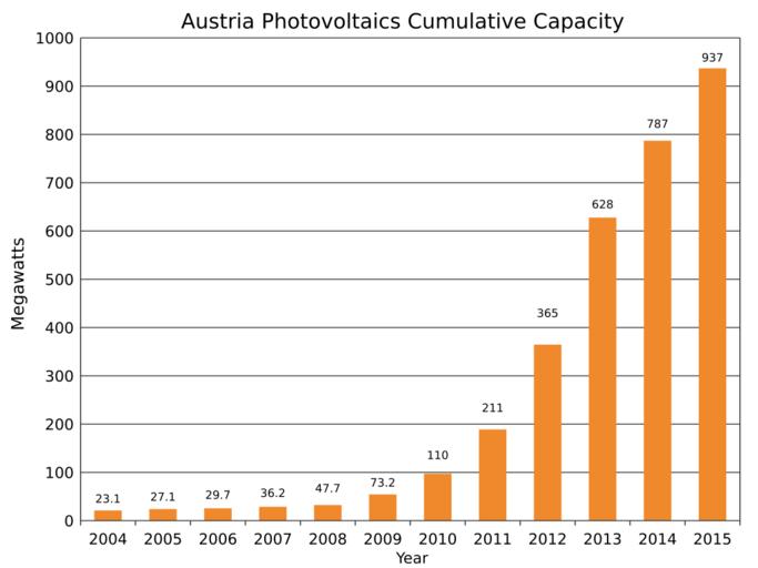 | Keywords: Austria Photovoltaics Installed Capacity.svg translate yes en Installed photovoltaics in Austria from 2004 to 2015 Source http //www iea-pvps org/index php id 92 eID dam_frontend_push docID 2795 IEA-PVPShttp //www iea-pvps org/fileadmin/dam/public/report/PICS/IEA-PVPS_-__A_Snapshot_of_Global_PV_-_1992-2015_-_Final_2_02 pdf 2016-03-10 own Delphi234 other versions cc-zero Solar energy in Austria Photovoltaic power statistics | ||||