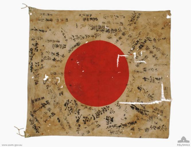 Keywords: Autographed good luck flag carried by Japanese soldier Miyake Yoshio in the Malayan campaign, 1941.jpg en Japanese soldier's autographed national flag featuring numerous Japanese signatures and patriotic slogans in black ink Apart from the traditional wish for long-lasting good fortune in war the slogans include 'Victory' and 'Congratulations on your enlistment' The name of the soldier to whom the flag was presented was Miyake Yoshio presumably killed in the Malayan campaign in 1941 <br> Summary Donor states flag was captured in Malaya in January 1941 When donor became a prisoner of war following the fall of Singapore he hid the flag in a 'Mae West' vest which he carried with him for use as a pillow REL/04411 author circa 1940 1941 PD-Australia Battle of Malaya Military life |