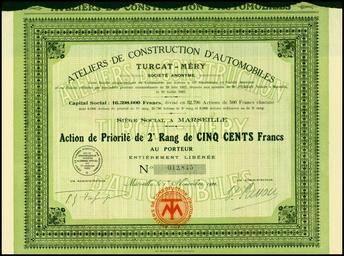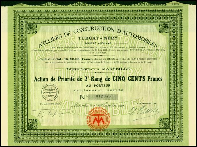 | Keywords: Automobiles Turcat-Mery 1921.jpg de Aktie über 100 Francs der Ateliers de Construction d'Automobiles Turcat-Méry SA vom 1 November 1921 1921-11-01 Sammlung eines Mitglieds des Ersten Deutschen Historic-Actien-Clubs e V EDHAC e V ; le Edhac-Edham other versions PD-old-70-1923 Bonds and Shares of EDHAC members Turcat-Méry vehicles |