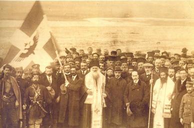 Keywords: AutonomyDeclaration1914.jpg Picture of the official declaration of Independence Argyrokastro now Gjirokastër on 1 March 1914 President Georgios Christakis and members of the provisional Government of Northern Epirus bishops Vasileios and Spyridon as well as local clergy military personnel and civilians pose together with the automony flag Drino/Drinos river in the backround Βορείου Η είρου στο Αργυρόκαστρο 1η αρτίου 1914 Εικονίζονται ο ρόεδρος τα μέλη στρατιωτική και ολίτες μαζί με την σημαία της αυτονομίας Στο βάθος ο οταμός Δρύνος Foto de la declaración oficial de Autonomía Los miembros del Gobierno provisional del norte de Epiro junto con el clero local oficiales y civiles constituyen junto con la bandera autonoma Gjirokastër 1 de marzo de 1914 Drino río Drinos en el trasfondo Официальное п овозглашение независимости 1 ма та 1914 года А ги окаст о ныне Ги окаст а П езидент Гео гиос Х истакис и члены в еменного п авительства Севе ного Эпи а епископы Василий и Спи идон местное духовенство военнослужащие и г ажданские лица вместе с флагом Севе ного Эпи а Позади видна ека Д ино Εθνικό και ιστορικό ουσείο Αθήνα National and historical museum in the Old Parliament House Athens Άγνωστος/ Unknown 1η αρτίου 1914 http //books google com/books hl el id UV1oAAAAMAAJ dq epirus+4000 q 221+March+1914 22 pgis 1 search_anchor Epirus 4000 years of Greek history and civilization M V Sakellariou Ekdotike Athenon 1997 ISBN 9789602133712 page 381 picture no 321 PD-old Collections of the National Historical Museum of Athens Drino River Autonomous Republic of Northern Epirus 1914 in Albania March 1914 Bishops of the Constantinople Orthodox Church |