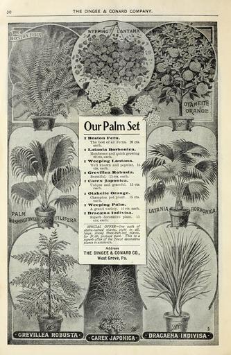 | Keywords: Autumn 1900 (16316548909).jpg  30 <br> THE DINGEE CONARD COMPANY <br> Our Palm Set <br> i Boston Fern <br> The best of all Ferns 20 cts <br> each <br> i Latania Bortoonica <br> Handsome and quick growing <br> 20 cts each <br> i 'Weeping Lantana <br> Well known and popular 15 <br> cts each <br> i Grevillea Robusta <br> Beautiful 15 cts each <br> i Carex Japonica <br> Unique and graceful 15 cts <br> each <br> i ©taneite Orange <br> Champion pot plant 15 cts <br> each <br> i 'Weeping Palm <br> A grand variety 15 cts each <br> i Dracaena Indivisa <br> Superb decorative plant 15 <br> cts each <br> SPECIAL OFFER ” One each of <br> abdbe-named olants eight in all <br> large strong ihree-inch-vot plants <br> for 1 00 postage paid This is a <br> superb offer' of the finest decorative <br> plants in existence <br> Address <br> THE DINGEE CONARD CO <br> West Grove Pa <br> iF <br> GREVILLEA ROBUSTA' OlTcAREX JAPONICA DRACAENA IHDIV1SA- 43803688 149033 77852 Page 30 Text http //www biodiversitylibrary org/page/43803688 1900 10 5962/bhl title 77852 Dingee Conard Co ; Henry G Gilbert Nursery and Seed Trade Catalog Collection NameFound Carex NameConfirmed Carex sect Hirtae Tuck ex Kük EOLID 29129 NameFound Dracaena NameConfirmed Dracaena Daudin 1802 EOLID 83827 NameFound Grevillea NameConfirmed Grevillea 'Robyn Gordon' EOLID 60829 NameFound Grevillea robusta NameConfirmed Grevillea robusta EOLID 582736 NameBankID 2651632 NameFound Lantana NameConfirmed Lantana L EOLID 37682 NameBankID 459108 NameFound Latania NameConfirmed Latania EOLID 35120 NameBankID 1850318 NameFound Robusta NameConfirmed Robusta NameBankID 4332975 Biodiversity Heritage Library Autumn 1900 our new guide to rose culture new album Garden Stories Bulbs Plants Catalogs Dingee Conard Co Flowers Nurseries Horticulture Nursery stock Roses Seeds Trade catalogs U S Department of Agriculture National Agricultural Library bhl page 43803688 dc identifier http //biodiversitylibrary org/page/43803688 bhlGardenStories Palms BHLinbloom bulbs plants dingee conard co nurseries horticulture u s department of agriculture national agricultural library bhlgardenstories bhlinbloom Information field Flickr posted date ISOdate 2015-02-11 CC-BY-2 0 BioDivLibrary https //flickr com/photos/61021753 N02/16316548909 2015-08-24 04 51 04 cc-by-2 0 PD-old-70-1923 Autumn 1900 Photos uploaded from Flickr by Fæ using a script |