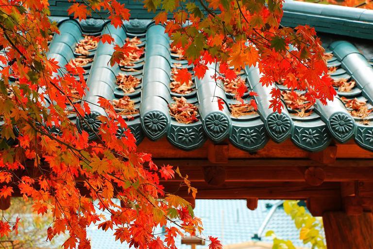 Keywords: autumn autumn leaves wood red maple leaf leaves the leaves leaf thatch roofed hose roof