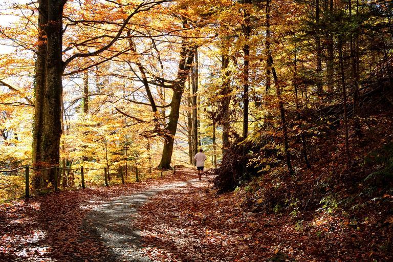 Keywords: autumn away forest trees jogger run nature leaves yellow red trail landscape autumn colours fall color mood emerge october golden autumn golden sky colorful forest path deciduous forest upper bavaria chiemgau atmospheric romantic sunlight