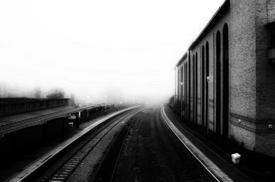 Keywords: autumn brown city curve curvy dull early fog foggy gloomy gray grey ground haze hazy iron line mist misty morning nobody old outdoors rail railroad railway road smog street tracks train transportation