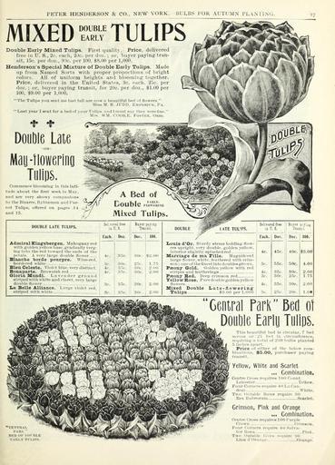 | Keywords: Autumn bulbs catalogue (15829404384).jpg PETER HENDERSON CO NEW YORK liULBS FOR ALTIMN I'LAMING <br> MIXED <br> DOUBLE <br> EARLY <br> Double Early Mixed Tulips Fiist qiialilv Price delivered <br> ri'i- in U S 2c' – – iuli ˘2' c per do/ ; or luiyec paying tran- <br> it 1 5c per do/ ' t h\ per lOO SS per 1 000 <br> Henderson's Special Mixture of Double Early Tulips Made <br> lip fri ia Named Sorts willi proper r poi tioiis of briytit <br> polor s AH of uniform liei chts and blooming tofretlier <br> Price deliveied in tlie Unit <br> eacli <br> doz ; or buyer paying transit for 20c per do/ 1 00 per <br> 100 9 00 per 1 000 <br> The TullpM vou Heut nif liinf nil ar now ii beuutiful IxmI iif lowerH <br> MiMM M IJ lUOI E Mi'OHii'M Pa <br> ' ˘ l/ast year I sent for a beil of vourTnlliiH iind I iiiust hiiv tliev were line <br> \Ii-H WM COUKIi KoHTEic Ohio <br> DoiiDle LaiG <br> UK- <br> May-llowerino <br> TllliDS <br> Commence blooming In IiIk luti- <br> tnile about the first week in Mav <br> an«l 'are very Hhowy eomimnlonK <br> to the Bizarre Xlybla-men and I'nr- <br> rot Tulips offered on pu en 14 <br> and IS <br> DOUBLE LATE TULIPS <br> Admiral Kingrsbergfen MnhoKanyred <br> with golden yellow base 'radually verj;- <br> Inir Into the red toward the endsof the <br> pi'talri A very lar e d nible llower <br> Blanche borde potirpre Wine-red <br> borili-ied white <br> Blen Celeste Vloht l lue very distinct <br> Bonaparte lirownl sh red <br> aioria Mtindi Lnvender ground <br> Htiipid with white and oluret vcrv large <br> doMl li- lloni-r ' <br> Iia Belle Alliance l nrKC violet red <br> htrip - l \ illl wliite <br> D -1-Ver i frM <br> ia U S <br> Buytr paying <br> Irausii <br> Each <br> Doz <br> Doz <br> 100 <br> 4c- <br> 85c <br> 30i' <br> ' 0 <br> 8c <br> 4f <br> 4c <br> 80c <br> 8 - C <br> 3 - C <br> 1 <br> a 'jc <br> 30c <br> 30c <br> 1 7- <br> ; ' oo <br> 2 00 <br> 3c <br> t <br> 30c <br> 2 00 <br> 3r <br> - – <br> ˘ Wr <br> ˘J OO <br> rionis d'Or Sturdy steins holding low- <br> ers uprifrlit very double jjolden yellow <br> interior sli htly sphu hed red <br> Marriag'e de ma Fille Mafrnitlcent <br> larpe flower white eatliered with crim- <br> son oneol'tlietinestlatedouiiiesjrrown <br> Pseony Gold tlolden yellow with red <br> r trijies ind featherinfrs <br> Paeony Hed Dwp crimson red <br> YellowBose Puredoiiblenolden yellow <br> Mowers <br> Uixed Donble laate-flo'trering' <br> Tulips – ' 0 1 iierl ooo <br> 4c <br> 3c <br> 45c <br> 55c <br> 85c <br> 30c <br> 35c <br> 40c <br> 50c <br> 80c <br> 25c <br> 30c <br> 2 V <br> 3 00 <br> 2 00 <br> 1 75 <br> 2 00 <br> 1 0« <br> CEXTllAL <br> l-AHK – ' <br> BKD OI-- liorBLE <br> 1 \1U V Tt'LlPS <br> Geniral Park Bed of <br> Doiil iG Eariu Tulips <br> TIiIm beaut ifnl bed is circular 7 fwt <br> across or -1 f '«'t in cin umference <br> nMinfrln r a tutal of – J t0 bulbs planted <br> inches apart <br> Price of I'i tiler of the below com- <br> biiialions 95 00 purchawr paying <br> transit <br> Yellow White and Scarlet <br> CombinatiOB <br> Centre Ooss ri' iulres lIMi Count <br> Leicester Yellow <br> Iour Corners re ulrv 40 La Cau- <br> deur White <br> Two Outside ItowH require 90 <br> Kex Hubrorum Scarlet <br> Crimson Pink and Orange <br> Combination <br> Centre Ctohb re ulreH 1 00 Purple <br> Crown CriinHon <br> Four Coniern n-ipilre 40 Sal va- <br> lor Uosa Pink <br> Two iiutside Kows rei iilre 0 <br> Llou d Oniimf Orange 43899729 149965 78524 Page 17 Text http //www biodiversitylibrary org/page/43899729 1900 10 5962/bhl title 78524 Henry G Gilbert Nursery and Seed Trade Catalog Collection ; Peter Henderson Co Biodiversity Heritage Library Autumn bulbs catalogue 1900 Garden Stories Bulbs Plants Catalogs Equipment and supplies Flowers Gardening Seeds Trade catalogues U S Department of Agriculture National Agricultural Library bhl page 43899729 dc identifier http //biodiversitylibrary org/page/43899729 Peter Henderson Co bhlGardenStories Double Early Tulips BHLinbloom bulbs plants u s department of agriculture national agricultural library peter henderson co bhlgardenstories double early tulips bhlinbloom Information field Flickr posted date ISOdate 2015-02-05 Check categories 2015 August 24 CC-BY-2 0 BioDivLibrary https //flickr com/photos/61021753 N02/15829404384 2015-08-24 23 57 20 cc-by-2 0 PD-old-70-1923 Autumn bulbs catalogue Photos uploaded from Flickr by Fæ using a script |