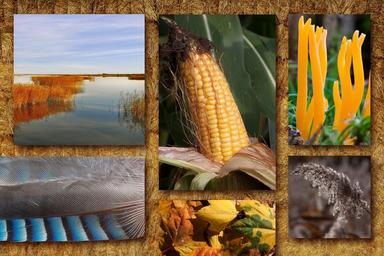 Keywords: autumn collage autumn mood autumn festival corn maple leaves corn on the cob feather jay mushrooms keulenpilz meadow coral hay bales
