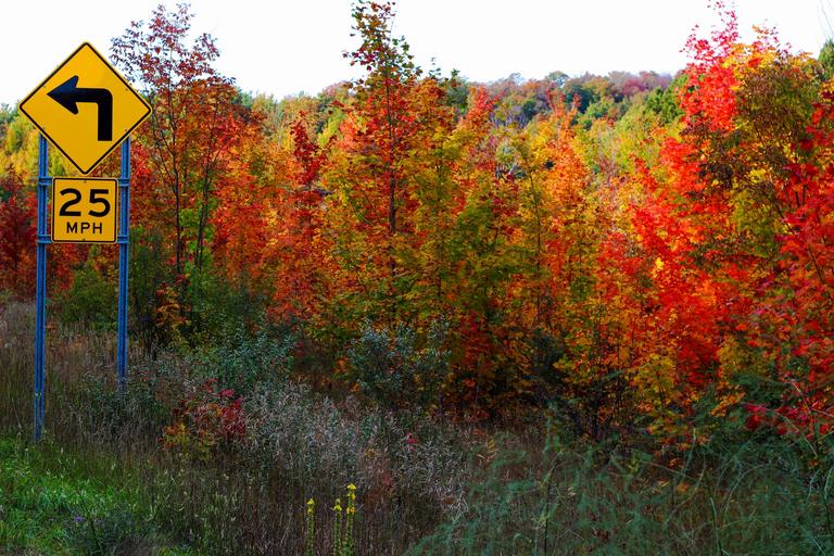 Keywords: autumn fall trees leaves colors colours speed limit road sign