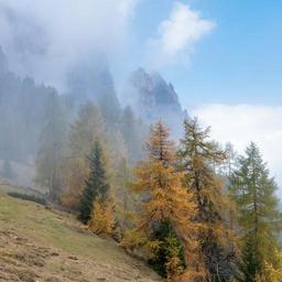 Keywords: autumn larch fall color golden autumn mountains fog mood autumn light dolomites south tyrol rock