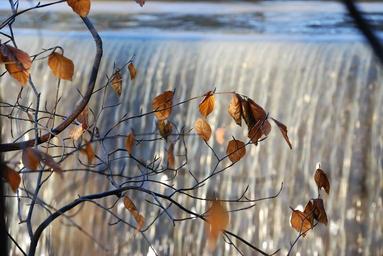 Keywords: autumn leaves golden foliage november environment branch fall sunlight waterfall