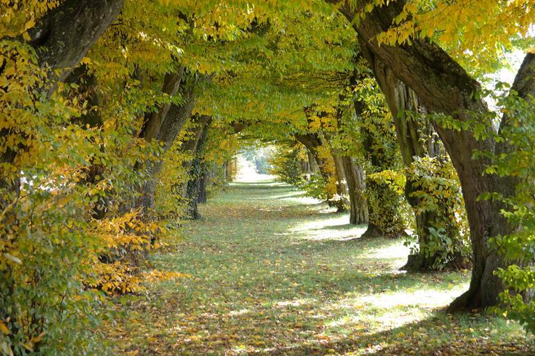 Keywords: avenue castle avenue laupheim hornbeam trees passage autumn fall color yellow coloring carpinus betulus white beech horn tree birch family betulaceae
