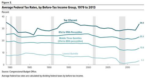 Keywords: Average US Federal Tax Rates 1979 to 2013.png Understanding the chart President Obama's tax increases on the highest income taxpayers raised their effective tax rates for 2013 There were two primary increases Expiration of the Bush tax cuts of 2001 and 2003 for the top 1 of taxpayers income over 400 000 or 450 000 for married filing tax returns jointly Payroll tax increases on incomes over 200 000 roughly the top 5 as part of the Affordable Care Act Obamacare Uploaded with en wp UW marker 2014 01 06 December 2013 Chart from the US Congressional Budget Office depicting tax rates by income group from 1979 to 2010 and implications for tax rates based on 2013 law https //www cbo gov/publication/51361; prior version at http //cbo gov/publication/44604 2013-12-04 US Congressional Budget Office publication 44604 Taxes PD-USGov |