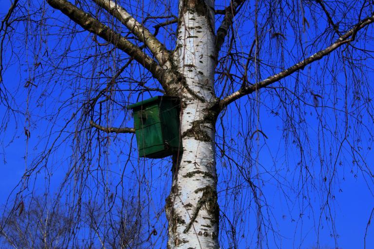 Keywords: aviary tree birch bird feeder sky blue azur aesthetic branches autumn winter nest
