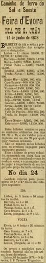 Keywords: Aviso CFS Feira Evora - Diario Illustrado 1891 1878.jpg pt Aviso da empresa estatal dos Caminhos de Ferro do Sul e Sueste em Portugal informando o público acerca de descontos nos bilhetes de vários pontos da rede ferroviária até Évora para uma feira no Dia de São João Esta imagem foi publicada no Diario Illustrado n º 1891 de 23 de Junho de 1878 e digitalizada pela Biblioteca Nacional de Portugal en Advertisement of the portuguese state operator Caminhos de Ferro do Sul e Sueste South and Southest Railways informing the public of discounts in the tickets from several points of the railway network until Évora for a fair in the St John Day This image was published on the Diario Illustrado newspaper No 1891 of 23rd June 1878 and scanned by the Biblioteca Nacional de Portugal 1878-06-10 http //purl pt/14328/1/j-1244-g_1878-06-23/j-1244-g_1878-06-23_item2/j-1244-g_1878-06-23_PDF/j-1244-g_1878-06-23_PDF_24-C-R0150/j-1244-g_1878-06-23_0000_1-4_t24-C-R0150 pdf Caminho de Ferro do Sul e Sueste other versions Institution Institution Biblioteca Nacional de Portugal Custom license marker 2016 08 18 Anonymous-EU Public transport information in Portugal 1878 in rail transport in Portugal Linha do Alentejo Linha do Sul Linha de Évora Ramal de Moura Caminho de Ferro do Sueste