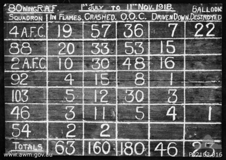 | Keywords: AWM P02163.016.jpg No 80 Wing RAF The aircraft tally board was probably in the briefing room or mess of the base and appears to consist of chalk marks on a wall rather than a special board It is dated 1918-07-01 to 1918-11-11 The squadrons listed are No 4 Squadron Australian Flying Corps AFC No 88 Squadron RAF No 2 Squadron AFC No 92 Squadron RAF No 103 Squadron RAF No 46 Squadron RAF and No 54 Squadron RAF The other columns are headed `In Flames' `Crashed' `O O C ' Out of Control `Driven Down' and `Balloons Destroyed' P02163 016 Donor N Storey Original housed in AWM Archive Store <br> en wikipedia Rcbutcher CommonsHelper Original uploader was Grant65 at http //en wikipedia org en wikipedia 2007 07 31 original upload date 1918-11 not stated PD-AustraliaGov PD-1996 Australia Original upload log page en wikipedia AWM_P02163 016 jpg 2007-07-31 09 29 Grant65 450×320× 102573 bytes <nowiki>Australian War Memorial summary Serny France 1918-11 Wing score board recording the results of various flying operations performed by No 80 Wing RAF The aircraft tally board was probably in the briefing room or mess of the base and appears to consi</nowiki> Australian Flying Corps Royal Air Force in World War I No 88 Squadron RAF Black and white photographs No 92 Squadron RAF No 54 Squadron RAF No 46 Squadron RAF No 103 Squadron RAF Kill scores No 2 Squadron RAAF No 4 Squadron RAAF |