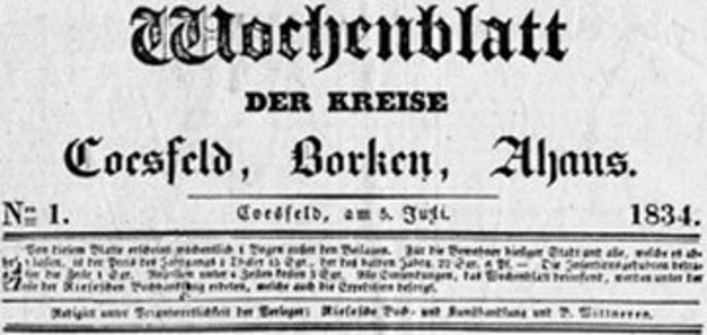 Keywords: Azc wochenblatt.jpg Titel des Wochenblatts der Kreise Coesfeld Borken Ahaus von 1834 http //www azonline de/historie/ Webseite der Allgemeinen Zeitung in Coesfeld 1834 author PD-old original upload log de wikipedia Yellowcard CommonsHelper page de wikipedia Azc_wochenblatt jpg 2009-05-26 06 41 Textkorrektur 360×171× 24340 bytes <nowiki> Information Titel des Wochenblatts der Kreise Coesfeld Borken Ahaus von 1834 http //www azonline de/historie/ Webseite der Allgemeinen Zeitung in Coesfeld unbekannt 1834 </nowiki> History of Coesfeld History of Ahaus History of Borken Westfalen Newspapers of Germany 1834 in Coesfeld 1834 in Borken Westfalen |