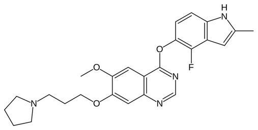 Keywords: AZD2171.svg Skeletal formula of the investigational kinase inhibitor AZD2171 Created using http //www acdlabs com/download/chemsk html ACD/ChemSketch 10 0 and Inkscape Own 2007-03-18 Fvasconcellos Indoles Phenol ethers Pyrimidines Azolidines Protein kinase inhibitors Anisoles Monofluorobenzenes |