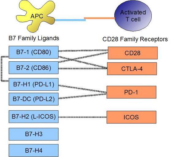 Keywords: B7 family ligands and CD28 family receptors.JPG en This diagram shows binding of costimulatory molecules on APCs and T cells It shows B7 family ligands and their interactions with CD28 family receptors Own The Immunologist 09-05-2009 cc-zero Immunology Costimulation |