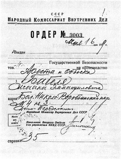 | Keywords: Babel order.jpg ru О де на а ест и обыск И Э Бабеля 1939-05-16 Шенталинский В Рабы свободы Документальные повести URL http //www e-reading club/bookreader php/1027640/Shentalinskiy_-_Raby_svobody_Dokumentalnye_povesti html КВД СССР other versions Custom license marker 2016 10 16 PD-RU-exempt Isaac Babel |