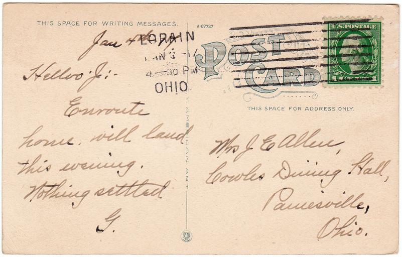 Keywords: postcard postmarked 1917 used curt teich co. curtteichco ohio c.t. american art ctamericanart allen cowles painesville, ohio painesvilleohio divided back dividedback white border era whiteborderera white border whiteborder stamp 1910s cancel wwi-era wwiera during wwi duringwwi stamps text writing document Description on front of card: Broadway, Lorain, Ohio. Publisher: C.T. American Art by Curt Teich Co., Chicago, Illinois Postmark on card: Jan 8, 1917 4:30 p.m. Message: Jan 4th, 17 Hello J: Enroute home. will laud this evening Nothing settled. G. Addressed to: Mrs. J.E. Allen Cowles Dining Hall Painesville, Ohio Used. Publisher Note: Curt Teich emigrated to Chicago in 1895. He had worked as a lithographer in Lobenstein, Germany. He founded the Curt Teich Company in 1898, concentrating on newspaper and magazine printing. He was an early publisher of postcards, but he didn't begin printing them himself until 1908. According to MetroPostcard.com, "As his competition dwindled, his sales expanded and his American factories would eventually turn out more postcards than any other in the United States. " The company was best known for their wide range of advertising and postcards of North America. By the 1920s, it was producing so many postcards with borders that they became recognized as a type dubbed "White Border Cards," creating an "era." Curt Teich started using offset presses in 1907, but it took a number of years before he had offset presses made to his satisfaction, and many more years for him to perfect the method. His innovations in this printing technique directly led to the production of what we now call "linens" by the early 1930s. The company aided the war effort during the second world war by also printing many military maps. Curt Teich eventually turned management of the company over to his son, but he remained active in company operations throughout its history. Curt Teich died in 1974 and the family business was sold to Regensteiner Publishers who continued to print postcards at the Chicago plant until 1978 when the rights to the company name and processes were sold to the Irish company, John Hinde Ltd. Their California subsidiary now prints postcards under the name John Hinde Curteich, Inc. Source: www.metropostcard.com/publisherst.html Description on front of card: Broadway, Lorain, Ohio. Publisher: C.T. American Art by Curt Teich Co., Chicago, Illinois Postmark on card: Jan 8, 1917 4:30 p.m. Message: Jan 4th, 17 Hello J: Enroute home. will laud this evening Nothing settled. G. Addressed to: Mrs. J.E. Allen Cowles Dining Hall Painesville, Ohio Used. Publisher Note: Curt Teich emigrated to Chicago in 1895. He had worked as a lithographer in Lobenstein, Germany. He founded the Curt Teich Company in 1898, concentrating on newspaper and magazine printing. He was an early publisher of postcards, but he didn't begin printing them himself until 1908. According to MetroPostcard.com, "As his competition dwindled, his sales expanded and his American factories would eventually turn out more postcards than any other in the United States. " The company was best known for their wide range of advertising and postcards of North America. By the 1920s, it was producing so many postcards with borders that they became recognized as a type dubbed "White Border Cards," creating an "era." Curt Teich started using offset presses in 1907, but it took a number of years before he had offset presses made to his satisfaction, and many more years for him to perfect the method. His innovations in this printing technique directly led to the production of what we now call "linens" by the early 1930s. The company aided the war effort during the second world war by also printing many military maps. Curt Teich eventually turned management of the company over to his son, but he remained active in company operations throughout its history. Curt Teich died in 1974 and the family business was sold to Regensteiner Publishers who continued to print postcards at the Chicago plant until 1978 when the rights to the company name and processes were sold to the Irish company, John Hinde Ltd. Their California subsidiary now prints postcards under the name John Hinde Curteich, Inc. Source: www.metropostcard.com/publisherst.html |