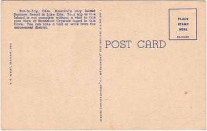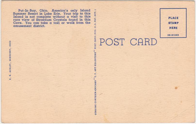 Keywords: postcard postcards unused unknown date unknowndate divided back dividedback linen put-in-bay putinbay put-in-bay, ohio putinbayohio ohio curt teich co. curtteichco curteich curteich-chicago curteichchicago c.t. art colortone ctartcolortone e.b. ackley ebackley lake erie lakeerie crystal cave crystalcave caves text writing Description on front of card: Crystal Cave, The Only Cave of Its Kind in the World, Put-In-Bay, Ohio, on Lake Erie No. in Series: 210 Description on card: Put-In-Bay, Ohio. America's only Island Summer Resort in Lake Erie. Your trip to this Island is not complete without a visit to this rare view of Strontium Crystals found in this Cave. You can take a taxi or walk from the amusement district. Published by: E.B. Ackley, Sandusky, Ohio / Curteich-Chicago "C.T. Art-Colortone" by Curt Teich Co., Chicago, Illinois Unused. The limestone Crystal Cave was discovered in 1897 and can still be visited today. Buy this card Publisher/Distributor Notes: Eugene B. Ackley (1871-1957) was a musician and band leader in Sandusky, Ohio. He also taught music at Sandusky High School. The photos and images were created by E.B. Ackley, but the cards were printed en masse by the Curt Teich Company in Chicago, Ill., under the trade name, "C.T. Art-Colortone." Sources: sanduskyhistory.blogspot.com/2006/12/eb-ackley-musician-b... sanduskyhistory.blogspot.com/2013/08/ohios-lake-erie-vaca... Curt Teich emigrated to Chicago in 1895. He had worked as a lithographer in Lobenstein, Germany. He founded the Curt Teich Company in 1898, concentrating on newspaper and magazine printing. He was an early publisher of postcards, but he didn't begin printing them himself until 1908. According to MetroPostcard.com, "As his competition dwindled, his sales expanded and his American factories would eventually turn out more postcards than any other in the United States." The company was best known for their wide range of advertising and postcards of North America. By the 1920s, it was producing so many postcards with borders that they became recognized as a type dubbed "White Border Cards," creating an "era." Curt Teich started using offset presses in 1907, but it took a number of years before he had offset presses made to his satisfaction, and many more years for him to perfect the method. His innovations in this printing technique directly led to the production of what we now call "linens" by the early 1930s. The company aided the war effort during the second world war by also printing many military maps. Curt Teich eventually turned management of the company over to his son, but he remained active in company operations throughout its history. Curt Teich died in 1974 and the family business was sold to Regensteiner Publishers who continued to print postcards at the Chicago plant until 1978 when the rights to the company name and processes were sold to the Irish company, John Hinde Ltd. Their California subsidiary now prints postcards under the name John Hinde Curteich, Inc. Source: www.metropostcard.com/publisherst.html Description on front of card: Crystal Cave, The Only Cave of Its Kind in the World, Put-In-Bay, Ohio, on Lake Erie No. in Series: 210 Description on card: Put-In-Bay, Ohio. America's only Island Summer Resort in Lake Erie. Your trip to this Island is not complete without a visit to this rare view of Strontium Crystals found in this Cave. You can take a taxi or walk from the amusement district. Published by: E.B. Ackley, Sandusky, Ohio / Curteich-Chicago "C.T. Art-Colortone" by Curt Teich Co., Chicago, Illinois Unused. The limestone Crystal Cave was discovered in 1897 and can still be visited today. Buy this card Publisher/Distributor Notes: Eugene B. Ackley (1871-1957) was a musician and band leader in Sandusky, Ohio. He also taught music at Sandusky High School. The photos and images were created by E.B. Ackley, but the cards were printed en masse by the Curt Teich Company in Chicago, Ill., under the trade name, "C.T. Art-Colortone." Sources: sanduskyhistory.blogspot.com/2006/12/eb-ackley-musician-b... sanduskyhistory.blogspot.com/2013/08/ohios-lake-erie-vaca... Curt Teich emigrated to Chicago in 1895. He had worked as a lithographer in Lobenstein, Germany. He founded the Curt Teich Company in 1898, concentrating on newspaper and magazine printing. He was an early publisher of postcards, but he didn't begin printing them himself until 1908. According to MetroPostcard.com, "As his competition dwindled, his sales expanded and his American factories would eventually turn out more postcards than any other in the United States." The company was best known for their wide range of advertising and postcards of North America. By the 1920s, it was producing so many postcards with borders that they became recognized as a type dubbed "White Border Cards," creating an "era." Curt Teich started using offset presses in 1907, but it took a number of years before he had offset presses made to his satisfaction, and many more years for him to perfect the method. His innovations in this printing technique directly led to the production of what we now call "linens" by the early 1930s. The company aided the war effort during the second world war by also printing many military maps. Curt Teich eventually turned management of the company over to his son, but he remained active in company operations throughout its history. Curt Teich died in 1974 and the family business was sold to Regensteiner Publishers who continued to print postcards at the Chicago plant until 1978 when the rights to the company name and processes were sold to the Irish company, John Hinde Ltd. Their California subsidiary now prints postcards under the name John Hinde Curteich, Inc. Source: www.metropostcard.com/publisherst.html |