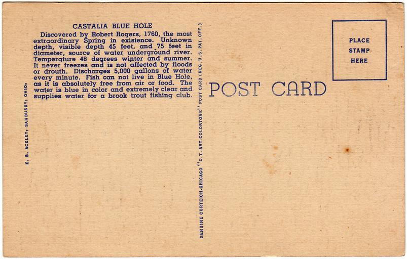Keywords: castalia castalia, ohio castaliaohio blue hole bluehole the blue hole thebluehole pond ponds tourist sites touristsites linen c.t. art-colortone ctartcolortone curteich-chicago curteichchicago curteich e.b. ackley ebackley date unknown dateunknown postcard postcards divided back dividedback white border whiteborder white border era whiteborderera text Description on front of card: Mill Pond and Fish Hatchery, Blue Hole, Castalia, Ohio No. in Series: 31 Publisher: E.B. Ackley, Sandusky, Ohio; Genuine Curteich-Chicago "C.T. Art-Colortone" post card, a tradename under Curt Teich Co., Chicago, Illinois Date: Unknown The Blue Hole is a freshwater pond and was a tourist site from the 1920s to 1990 and had 165,000 visitors annually. Wikipedia: en.wikipedia.org/wiki/Blue_Hole_(Castalia) Publisher/Distributor Notes: Eugene B. Ackley (1871-1957) was a musician and band leader in Sandusky, Ohio. He also taught music at Sandusky High School. The photos and images were created by E.B. Ackley, but the cards were printed en masse by the Curt Teich Company in Chicago, Ill., under the trade name, "C.T. Art-Colortone." Sources: sanduskyhistory.blogspot.com/2006/12/eb-ackley-musician-b... sanduskyhistory.blogspot.com/2013/08/ohios-lake-erie-vaca... Curt Teich emigrated to Chicago in 1895. He had worked as a lithographer in Lobenstein, Germany. He founded the Curt Teich Company in 1898, concentrating on newspaper and magazine printing. He was an early publisher of postcards, but he didn't begin printing them himself until 1908. According to MetroPostcard.com, "As his competition dwindled, his sales expanded and his American factories would eventually turn out more postcards than any other in the United States. " The company was best known for their wide range of advertising and postcards of North America. By the 1920s, it was producing so many postcards with borders that they became recognized as a type dubbed "White Border Cards," creating an "era." Curt Teich started using offset presses in 1907, but it took a number of years before he had offset presses made to his satisfaction, and many more years for him to perfect the method. His innovations in this printing technique directly led to the production of what we now call "linens" by the early 1930s. The company aided the war effort during the second world war by also printing many military maps. Curt Teich eventually turned management of the company over to his son, but he remained active in company operations throughout its history. Curt Teich died in 1974 and the family business was sold to Regensteiner Publishers who continued to print postcards at the Chicago plant until 1978 when the rights to the company name and processes were sold to the Irish company, John Hinde Ltd. Their California subsidiary now prints postcards under the name John Hinde Curteich, Inc. Source: www.metropostcard.com/publisherst.html Description on front of card: Mill Pond and Fish Hatchery, Blue Hole, Castalia, Ohio No. in Series: 31 Publisher: E.B. Ackley, Sandusky, Ohio; Genuine Curteich-Chicago "C.T. Art-Colortone" post card, a tradename under Curt Teich Co., Chicago, Illinois Date: Unknown The Blue Hole is a freshwater pond and was a tourist site from the 1920s to 1990 and had 165,000 visitors annually. Wikipedia: en.wikipedia.org/wiki/Blue_Hole_(Castalia) Publisher/Distributor Notes: Eugene B. Ackley (1871-1957) was a musician and band leader in Sandusky, Ohio. He also taught music at Sandusky High School. The photos and images were created by E.B. Ackley, but the cards were printed en masse by the Curt Teich Company in Chicago, Ill., under the trade name, "C.T. Art-Colortone." Sources: sanduskyhistory.blogspot.com/2006/12/eb-ackley-musician-b... sanduskyhistory.blogspot.com/2013/08/ohios-lake-erie-vaca... Curt Teich emigrated to Chicago in 1895. He had worked as a lithographer in Lobenstein, Germany. He founded the Curt Teich Company in 1898, concentrating on newspaper and magazine printing. He was an early publisher of postcards, but he didn't begin printing them himself until 1908. According to MetroPostcard.com, "As his competition dwindled, his sales expanded and his American factories would eventually turn out more postcards than any other in the United States. " The company was best known for their wide range of advertising and postcards of North America. By the 1920s, it was producing so many postcards with borders that they became recognized as a type dubbed "White Border Cards," creating an "era." Curt Teich started using offset presses in 1907, but it took a number of years before he had offset presses made to his satisfaction, and many more years for him to perfect the method. His innovations in this printing technique directly led to the production of what we now call "linens" by the early 1930s. The company aided the war effort during the second world war by also printing many military maps. Curt Teich eventually turned management of the company over to his son, but he remained active in company operations throughout its history. Curt Teich died in 1974 and the family business was sold to Regensteiner Publishers who continued to print postcards at the Chicago plant until 1978 when the rights to the company name and processes were sold to the Irish company, John Hinde Ltd. Their California subsidiary now prints postcards under the name John Hinde Curteich, Inc. Source: www.metropostcard.com/publisherst.html |
