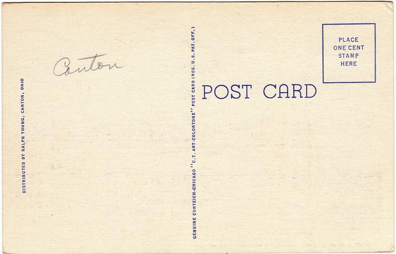 Keywords: postcard unused linen divided back dividedback ralph young ralphyoung curt teich co. curtteichco c.t. art-colortone ctartcolortone date unknown dateunknown unknown date unknowndate white border whiteborder white border era whiteborderera text writing Description on front of card: Public Square Showing Court House, Canton, Ohio Distributor: Ralph Young, Canton, Ohio | Genuine Curteich-Chicago "C.T. Art-Colortone" post card by Curt Teich Co., Chicago, Illinois Date: Unknown (Est. 1930s) Used. Publisher Note: Curt Teich emigrated to Chicago in 1895. He had worked as a lithographer in Lobenstein, Germany. He founded the Curt Teich Company in 1898, concentrating on newspaper and magazine printing. He was an early publisher of postcards, but he didn't begin printing them himself until 1908. According to MetroPostcard.com, "As his competition dwindled, his sales expanded and his American factories would eventually turn out more postcards than any other in the United States." The company was best known for their wide range of advertising and postcards of North America. By the 1920s, it was producing so many postcards with borders that they became recognized as a type dubbed "White Border Cards," creating an "era." Curt Teich started using offset presses in 1907, but it took a number of years before he had offset presses made to his satisfaction, and many more years for him to perfect the method. His innovations in this printing technique directly led to the production of what we now call "linens" by the early 1930s. The company aided the war effort during the second world war by also printing many military maps. Curt Teich eventually turned management of the company over to his son, but he remained active in company operations throughout its history. Curt Teich died in 1974 and the family business was sold to Regensteiner Publishers who continued to print postcards at the Chicago plant until 1978 when the rights to the company name and processes were sold to the Irish company, John Hinde Ltd. Their California subsidiary now prints postcards under the name John Hinde Curteich, Inc. Source: www.metropostcard.com/publisherst.html Description on front of card: Public Square Showing Court House, Canton, Ohio Distributor: Ralph Young, Canton, Ohio | Genuine Curteich-Chicago "C.T. Art-Colortone" post card by Curt Teich Co., Chicago, Illinois Date: Unknown (Est. 1930s) Used. Publisher Note: Curt Teich emigrated to Chicago in 1895. He had worked as a lithographer in Lobenstein, Germany. He founded the Curt Teich Company in 1898, concentrating on newspaper and magazine printing. He was an early publisher of postcards, but he didn't begin printing them himself until 1908. According to MetroPostcard.com, "As his competition dwindled, his sales expanded and his American factories would eventually turn out more postcards than any other in the United States." The company was best known for their wide range of advertising and postcards of North America. By the 1920s, it was producing so many postcards with borders that they became recognized as a type dubbed "White Border Cards," creating an "era." Curt Teich started using offset presses in 1907, but it took a number of years before he had offset presses made to his satisfaction, and many more years for him to perfect the method. His innovations in this printing technique directly led to the production of what we now call "linens" by the early 1930s. The company aided the war effort during the second world war by also printing many military maps. Curt Teich eventually turned management of the company over to his son, but he remained active in company operations throughout its history. Curt Teich died in 1974 and the family business was sold to Regensteiner Publishers who continued to print postcards at the Chicago plant until 1978 when the rights to the company name and processes were sold to the Irish company, John Hinde Ltd. Their California subsidiary now prints postcards under the name John Hinde Curteich, Inc. Source: www.metropostcard.com/publisherst.html