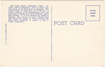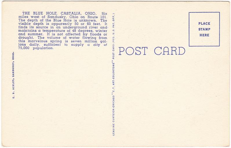 MAKE A MEME View Large Image Description on front of card: Watching the Fish in the Trout Stream at the Blue Hole, Castalia, Ohio No. in Series: 25 Description on back of card: THE BLUE HOLE, CASTALIA, OHIO. Six miles west of Sandusky, Ohio, on Route 101. The depth of ...